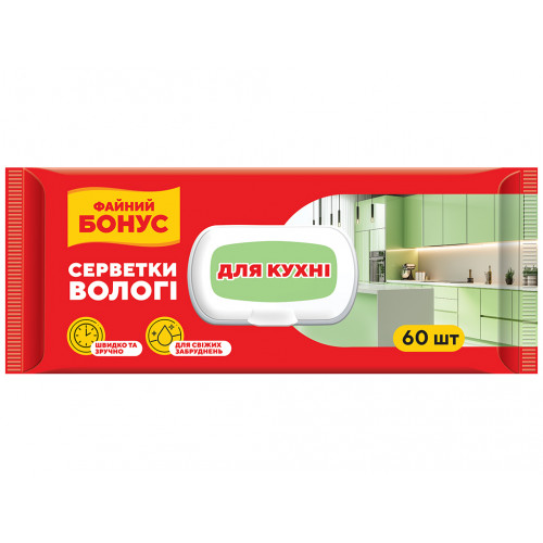 Серветки Файний Бонус — це не просто вологі ганчірки, а готовий мийний засіб з активним просоченням, створений для кухні, де щодня з'являються жир, пара, крихти, бризки та пил. Основа — неткане полотно щільністю 42 г/м²: багатошаровий матеріал, який не розповзається при терті, не залишає ворсу на глянцевих фасадах і не рветься при витиранні засохлих плям. Розмір 20×18 см розрахований під стандартні зони: однієї серветки достатньо для конфорки, стільниці, дверцят шафи або підвіконня. Просочення — це активна формула, яка розчиняє жир, сліди соусів, крихти, відбитки пальців та пил. Вона не залишає липкої плівки, після висихання поверхня залишається чистою і рівною — матовою або глянцевою, залежно від початкового покриття. Склад випаровується повністю, без розводів та необхідності повторного протирання. Серветки підходять для плит — не дряпають емаль і не матують склокераміку. Для стільниць — не знебарвлюють ламінат і не сушать дерево. Для кераміки — не роз'їдають затірку і не залишають білих слідів. Для металевої сантехніки — не залишають подряпин і не тьмяніють хроми. Для пластику — не викликають помутніння. Для віконних рам та підвіконь — не залишають волокон і не вимагають полірування. М'яка структура зберігає покриття: не шліфує, не залишає мікроподряпин, які потім збирають бруд. Це означає, що меблі, техніка та сантехніка довше виглядають як нові — без потертостей, матовості та слідів агресивного прибирання. Упаковка з клапаном зберігає вологість: клапан герметично закривається після кожного використання, запобігаючи пересиханню. Аромат свіжий і легкий. Він не маскує бруд, а створює відчуття чистоти.