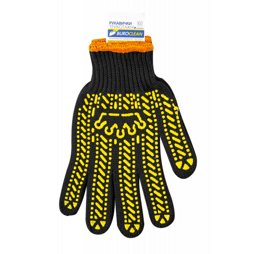 Трикотажні рукавички від Buroclean з пряжі чорного кольору та платуванням. Платування - це спеціальний спосіб в'язки, при якому пряжа в рукавичці розподіляється шарами: шар бавовни всередині а шар поліестеру зовні, що одночасно забезпечує комфортний мікроклімат для шкіри рук, і підвищену стійкість до стирання. Край манжети оверлочений, що не допускає його розпускання, не має швів. Під край манжети укладена гумка для кращого прилягання до руки. Призначені для важких будівельних робіт, вантажно-розвантажувальних робіт; господарських та механічних робіт тощо.