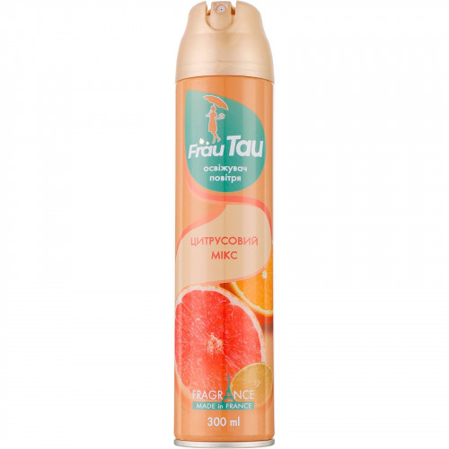 Основні характеристики Тип засобу: аерозоль Об'єм/Вага: 300 мл Кількість у наборі: 1 шт Склад: вода демінералізована, спирт етиловий денатурований, неіоногенні ПАР <5%, ароматизатор, консервант Спосіб застосування: добре струсіть, тримаючи балон вертикально, натисніть на клапан і розпилюйте вміст балона від себе у центр приміщення. Упаковка: алюмінієвий балон Виробник: ТОВ "Фабрика Миловарні Традиції", Frau Tau Країна-виробник: Україна
