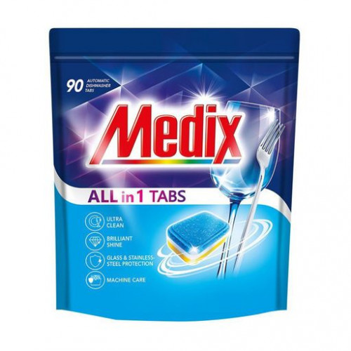 MEDIX ALL in 1 TABS - таблетки для миття посуду в посудомийних машинах. Мають потужну формулу з комплексом ферментів і активним киснем для ефективної дії проти жиру і засохлих залишків їжі на посуді. Вони забезпечують кришталеву чистоту та захист посуду. З MEDIX ALL in 1 TABS ви досягнете чудових результатів навіть за недостатньої кількості солі та ополіскувача в посудомийній машині.