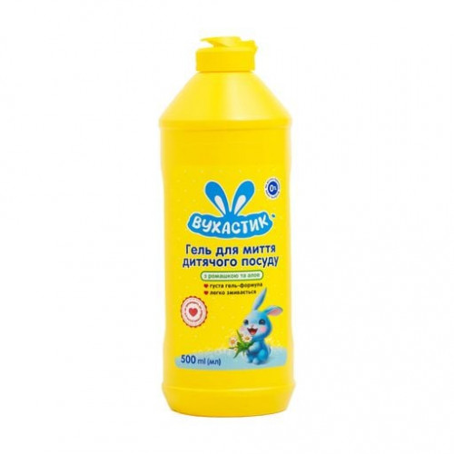 Гель для миття дитячого посуду Вухастик створений спеціально для миття дитячого посуду, пляшечок зі скла й пластику, сосок із латексу й силікону, іграшок. Його м’яка формула ефективно видаляє різні забруднення на будь-яких поверхнях, з якими стикається дитина з перших днів життя. Засіб не містить мила, барвників, фосфатів і хлору.