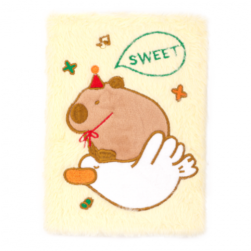 Блокнот має м'якеньку обкладинку зі штучного хутра, з дизайном у вигляді мультяшної фігурки капібари.