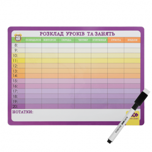 кольорова поверхня, має лініювання для запису розкладу занять та ін. заходів з 8 до 20 години на кожен день тижня, а також поле для фіксації додаткової інформації