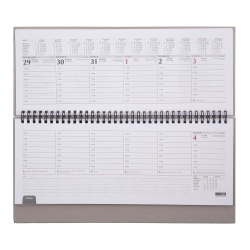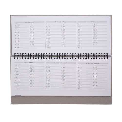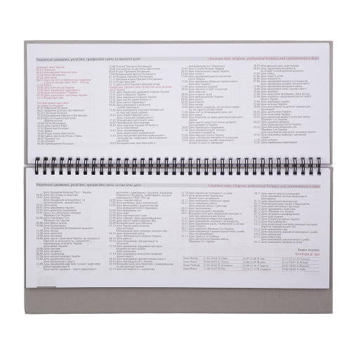 Дві сторінки (розворот) містять вертикально розміщені 7 днів тижня (субота та неділя в одному стовпчику) з організатором часу від 7:00 до 20:00, календар на рік та на поточний місяць, знак зодіаку, іменинників, свята та пам'ятні дати на кожен день, а також вільне поле для нотаток