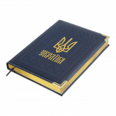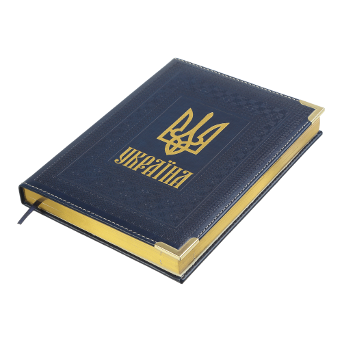 Жорстка обкладинка зі штучної шкіри щоденника STATUT багато оформлена українськими елементами. Лицьова сторона обкладинки вкрита декоративним сліпим тисненням у вигляді національних візерунків. По центру лицьової сторони методом фольгування нанесений великий золотий Тризуб. Куточки обкладинки оформлені металевими золотистими накладками. Гармонійно доповнюють дизайн щоденника сліпе тиснення року на корінці, тонований золотом зріз та декоративний шов по периметру.