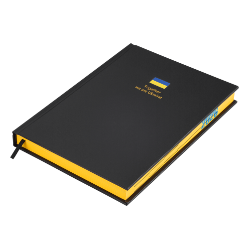 Жорстка обкладинка з бумвінілу з поролоном щоденника BRAVE виконана у патріотичному дизайні з нанесенням Прапора України та тисненням золотою фольгою надихаючого напису. Гармонійно підкреслює дизайн тонований зріз внутрішнього блоку в національних кольорах: жовта основа та блакитний напис року.