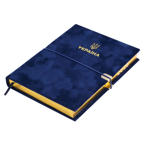 Жорстка обкладинка зі штучної шкіри з інтенсивним оксамитовим покриттям щоденника PATRIOT VELOUR виконана у розкішному стилі з національною символікою - оздоблена тисненням Тризуба та напису УКРАЇНА золотою фольгою. Дві функціональні шильди на лицьовій та зворотній стороні обкладинки з поглибленнями для поперечної гумки забезпечують зручну та надійну фіксацію щоденника в закритому стані. Гармонійно доповнює та збагачує дизайн щоденника тонований золотом зріз внутрішнього блоку з нанесенням року.