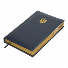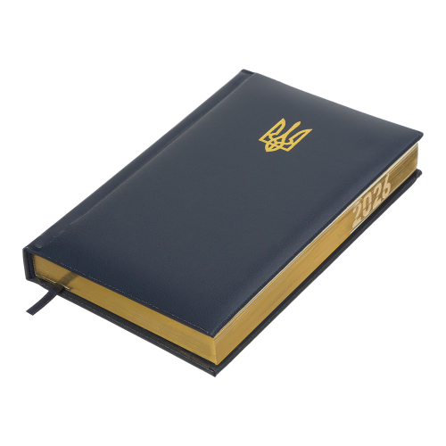 Жорстка обкладинка з бумвінілу з поролоном щоденника POWERFUL виконана у патріотичному мотивуючому дизайні з яскравими акцентами - тиснення Державного Герба та напису золотою фольгою. Гармонійно доповнює дизайн тонований золотом зріз внутрішнього блоку з нанесенням року.