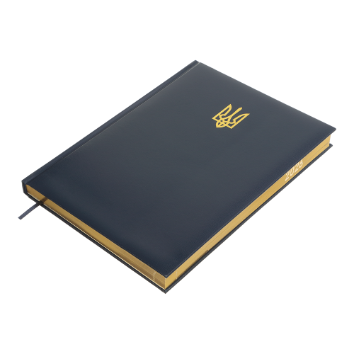 Жорстка обкладинка з бумвінілу з поролоном щоденника POWERFUL виконана у патріотичному мотивуючому дизайні з яскравими акцентами - тиснення Державного Герба та напису золотою фольгою. Гармонійно доповнює дизайн тонований золотом зріз внутрішнього блоку з нанесенням року.
