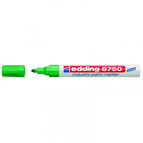 Маркер лаковий Industry Paint e-8750, для нанесення перманентних написів в агресивних промислових умовах,слід (2-4 мм) стійкий до кислот, розчинників, механічного стирання, напис витримує від -30 °С до +30 °С. Застосовується для письма на жирних, вкритих пилом, брудних поверхнях. Стійкий до кислот, розчинників, механічного стирання. Чорнило маркера e-8750 містить високу концентрацію пігменту, що дозволяє йому добре лягати на гладкі і шорсткі поверхні. Спеціальні добавки, введені до складу маркера e-8750, розчиняють масляну плівку на поверхні письма. Непрозоре лакове чорнило дозволяє робити добре помітні написи густим щільним шаром навіть на темних поверхнях. Маркер e-8750 добре зарекомендував себе в роботі при перепадах температур від -30°С до +30°С. Маркер e-8750 також може використовуватися як універсальний, наприклад, при нанесенні позначок на різнорідні матеріали. При маркуванні виробів з гуми, пластику, металу, скла, спецодягу немає необхідності використовувати різні маркери, можна обійтися одним - e-8750. Ширина сліду 2-4 мм. Колір чорнила: зелений.