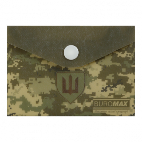 Папка-конверт на кнопці серії MILITARY від BUROMAX підходить для зберігання і транспортування візиток, пластикових карт, перепусток чи проїздних квитків. Папка виконана в актуальному дизайні піксель, стримана, не марка. Папка стане в нагоді співробітникам різних сфер діяльності, як цивільних так і військових, а також студентам та школярам, захистить вміст від зминання, намокання чи забруднення.