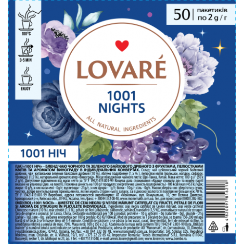 Чудова чайна суміш 1001 Ніч від Lovare — цейлонський чорний дрібний чай, китайський зелений дрібний чай зі шматочками фруктів, пелюстками квітів і ароматом винограду. Чудовий напій із багатою палітрою смаків і ароматів — дивовижний і непередбачуваний, терпкий і ніжний, справжнє втілення східних казок. Суміш чорного та зеленого чаю з фруктами збадьорить і підніме ваш настрій.