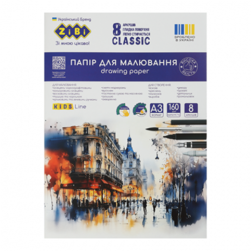 Папір для малювання серії CLASSIC від ZiBi - підходить для малювання графітовими, кольоровими та восковими олівцями, акварельними та гуашевими фарбами, сухою, масляною пастеллю та вугіллям, тушшю, чорнилом, кульковими та гелевими ручками, маркерами та фломастерами. Може використовуватися дітьми та дорослими для створення ескізів, малюнків, креслень, орігамі, декору та інших видів творчості.