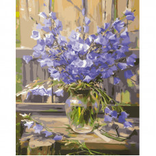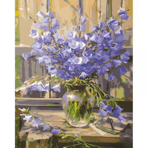 Картина за номерами Strateg ПРЕМІУМ Фіолетові квіти у вазі з лаком та з рівнем розміром 40х50 см (GS1469)