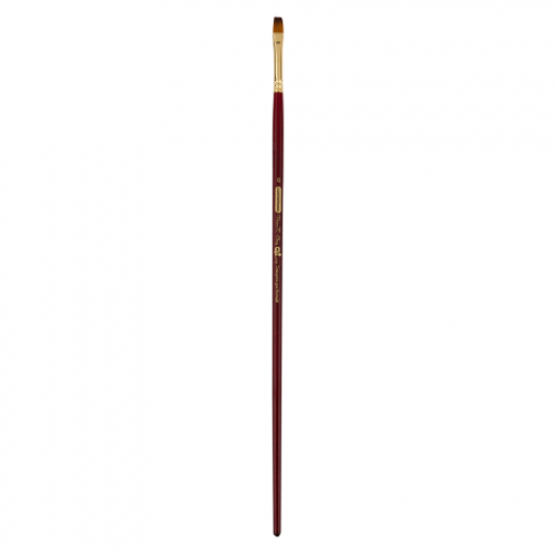 Високоякісний синтетичний волос (імітація колонка) вирізняється дуже високою м’якістю, еластичністю і пружністю. Матеріал ручки – натуральна деревина, пофарбована в стильний вишневий колір і покрита лаком. Обойма – безшовна, з нікельованої латуні. Плоским пензлем наносять широкі рівні мазки – він незамінний помічник при роботі з крупними ділянками полотна, коли потрібно нанесення широких рівних мазків постійної товщини. У разі потреби можна змінювати товщину мазку, змінюючи поворот пензля в процесі малювання. Плоский пензель дуже зручний при зображенні таких елементів природи, як земля, трава, листя, відносно точних обрисів. Рекомендується для всіх розповсюджених видів фарб. Незамінний при роботі з рідкими фарбами - гуашшю і аквареллю - коли від пензля потрібна висока пружність. При роботі з аквареллю дає матовий, пом’якшений шар кольору. Добре регулює текучість фарби і інтенсивність кольору шару. Прекрасно веде себе і з пастозними густими фарбами - олією і акрилом, як в густому, так і в розведеному вигляді.